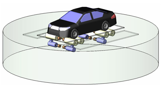 6軸の多軸走行ロボット試験機です。 慣性を含む走行抵抗から耐久試験までテスト出来ます。 |